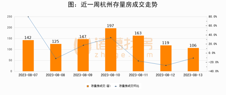 从存量房来看,2023年08月13日杭州存量房单日成交106套,比昨日减少13套,环比下降10.9%。从近一周存量房成交来看,杭州存量房日均成交套数为142套,08月13日单日成交106套,低于近一周平均水平25.4%。