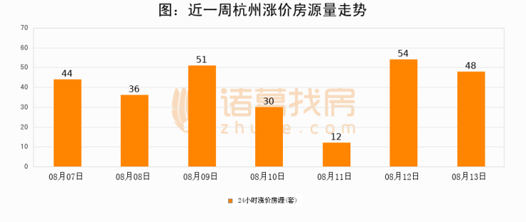 根据诸葛找房数据显示,杭州24小时涨价房源量为48套,较08月12日减少6套,环比下降11.1%。与此同时,涨价房源占比小幅回落,对于购房者来说是一个入市窗口期,购房者可抓住时机入市。