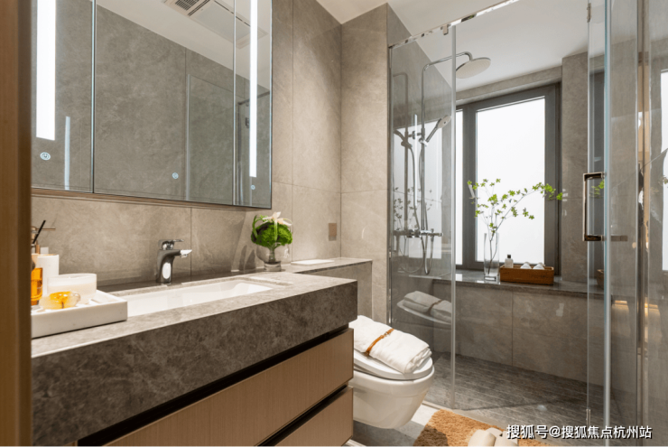细节相当多,再提一点,卫生间台面都选用天然石材,触感光滑、厚重。