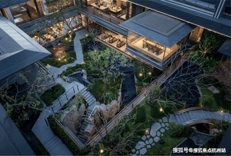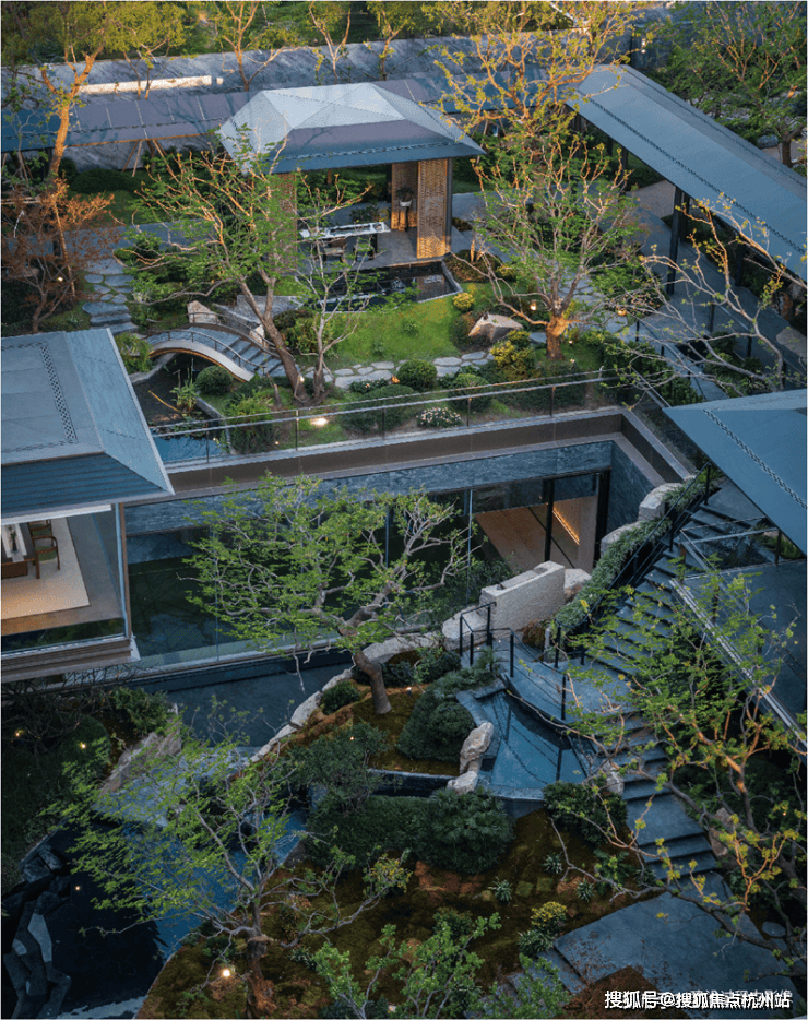 而最令人惊艳的,当属约6米地势差打造的下沉式山水庭院,山、石、水、林有序交织,犹如一幅“豁然开朗”山水轴卷,每一步皆是景致,每一处皆有不同。