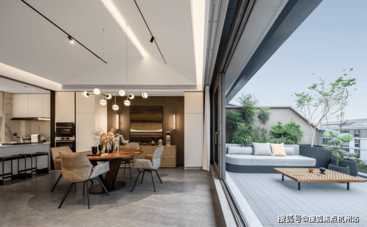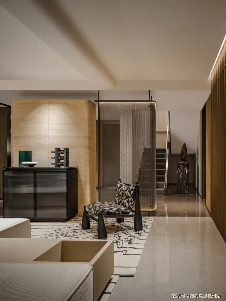 客厅,西厨餐厅,中厨吧台与圆桌餐厅都在四层的空间,如何让每个区域更加完整,且动线合理,设计师重新调整了入口方向,需要多走几步路,绕一个弯后才能进入。但这样的设计恰恰让人可以放慢脚步,调整工作和生活的节奏,增加了归家的仪式感。