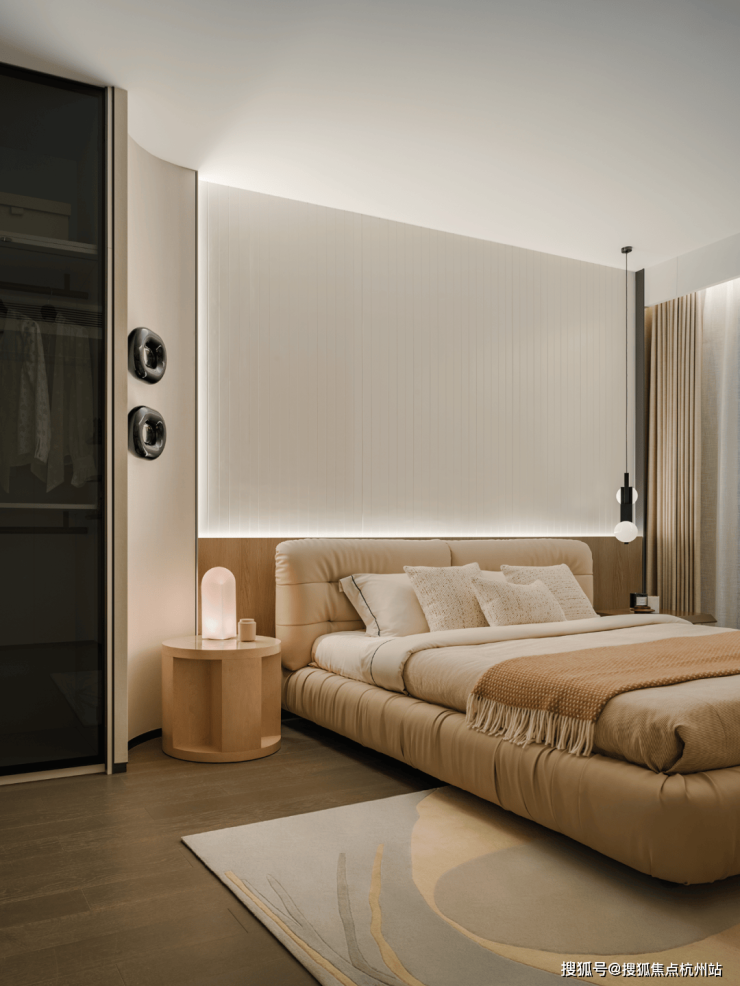 细密精致线条的木饰面与高贵石材结合奠定了经典纯粹的美感。所有休憩空间全部采用无主灯设计,柔和布光,且从公区到衣帽间,至卧榻一步步光影由明转暗,逐步带来放松的感受。