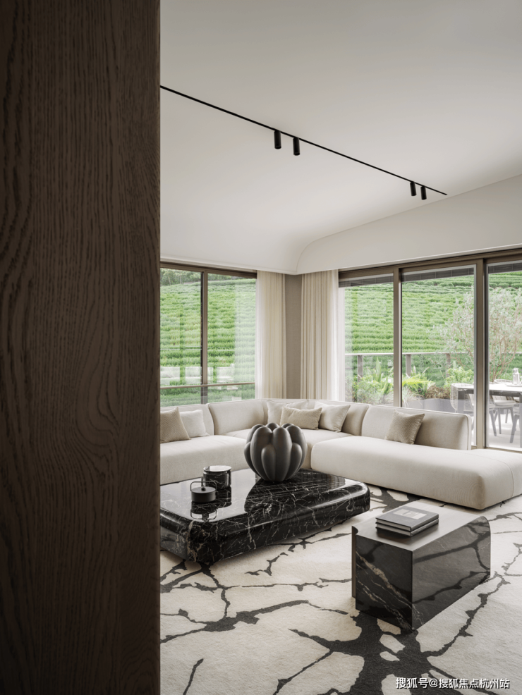 180°开阔落地窗的景观会客厅实现了聚山水田园于咫尺之间,四季葱郁的绿意作为会客饮茶的背景,恐怕是最奢侈的了。家不单是居住的场所,还是积累人生经历与收藏的容器,通过空间重新构建主人的精神世界,以收藏为叙事,更能满足一家人对于生活的想象和憧憬。