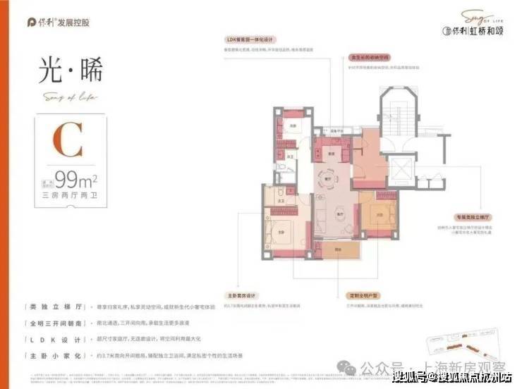 建面约99㎡3房2卫户型不仅保留三开间朝南和餐客厅一体化的优势,更在尺度上大踏步进阶。 主卧面宽高达约3.7米,客厅面宽高达约3.75米,适配有尺度改善需求的客户,而市面上同面积段产品尺度基本为客厅面宽约3.5米,主卧约3.3米。