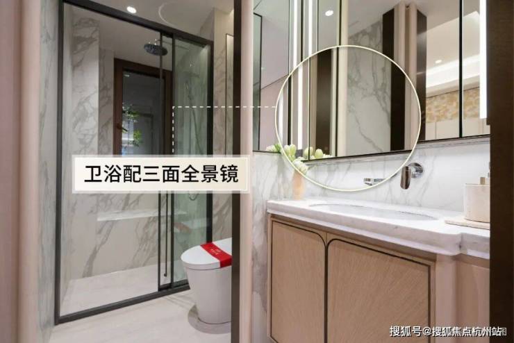 镜子是三面镜,女士打理发型、查看背部穿搭都更方便;主卫还定制 美妆冰箱,贴心满满。