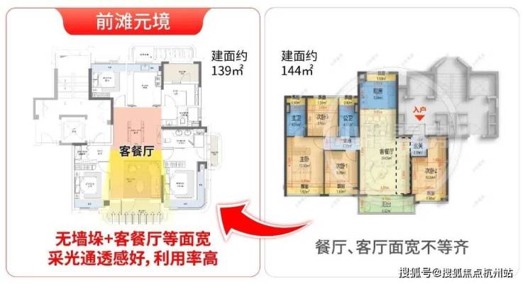 尤其约139㎡户型,客厅 无墙垛设计让阳光可长驱直入,加之客餐厅等面宽布局,通透感拉满;反观市面上多数户型,客餐厅衔接不规则,大大影响餐厅的居住舒适度。