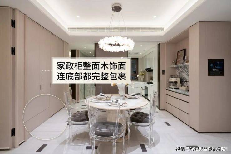 约109㎡餐厅旁家政柜整面同色系木饰面, 底部完整包覆,保证视觉完整统一。