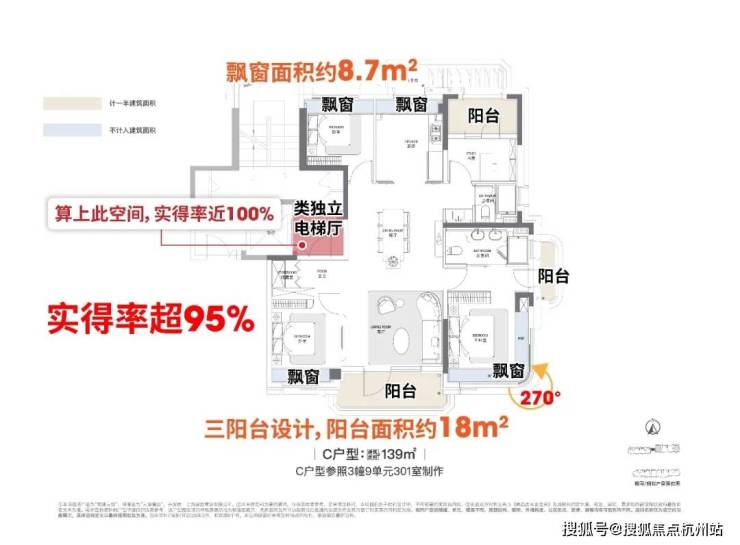 得房率 85%-88%,主力户型实得率超 95%,139㎡户型附加电梯厅后接近 100%。
