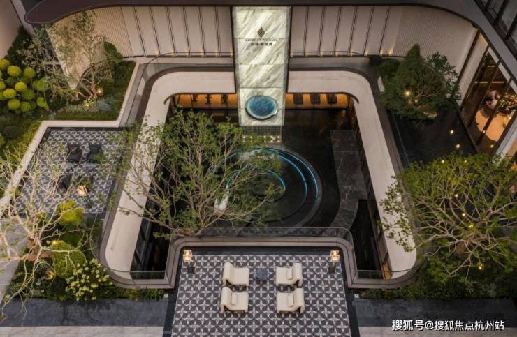行政酒廊采用下沉式设计,复刻自西溪安达仕酒店,面朝灵秀水院,格调非同一般。此部分目前将会作为售楼部接待区呈现,后期会调整为会所的行政酒廊,可提前享受会所质感服务。