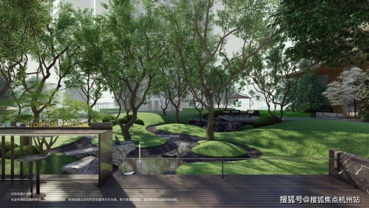泉之境,主要景观为水庭跌瀑廊架组成的御泽石亭,还有树王庭院和大草坪,特别适合邻里社交与亲子互动。