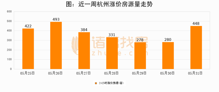 根据诸葛找房数据显示,杭州24小时涨价房源量为448套,较05月30日增加168套,环比上涨60%。与此同时,涨价房源占比小幅扩大,业主信心有所提升。