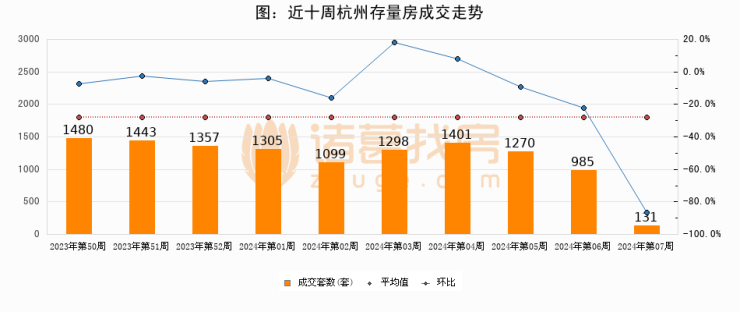 存量房方面,第06周杭州存量房成交131套,较上周减少854套,环比下降86.7%。从近十周成交走势来看,周均成交套数为1176套,本周低于平均水平88.9%。