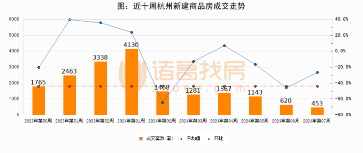 进入2024年第06周(02月05日-02月11日),杭州新建商品房成交453套,较上周减少167套,环比下降26.9%