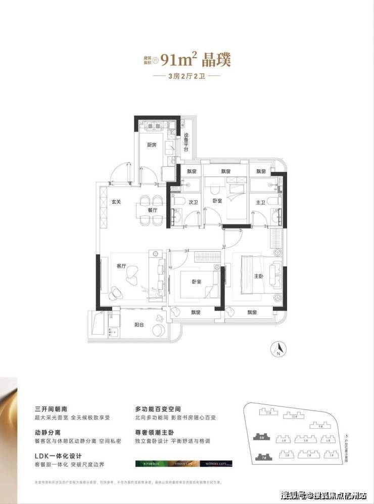 建面约91㎡做3房2卫,三开间朝南、3房5飘窗1阳台 ,整体室内的采光、视野以及通风都相当出彩。 动静分离+主卧套房的设计, 保证了整体居住的安静和私密性。