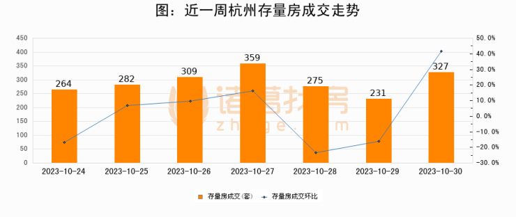 从存量房来看,2023年10月30日杭州存量房单日成交327套,比昨日增加96套,环比上涨41.6%。从近一周存量房成交来看,杭州存量房日均成交套数为292套,10月30日单日成交327套,高于近一周平均水平12%。