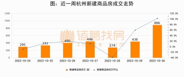 根据杭州市住房保障和房产管理局数据显示,2023年10月30日杭州新建商品房成交886套,较昨日增加448套,环比上涨102.3%