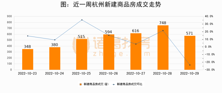 根据杭州市住房保障和房产管理局数据显示,2022年10月29日杭州新建商品房成交571套,较昨日减少177套,环比下降23.7%。近一周杭州新建商品房日均成交539套,其中,10月28日成交量较高为748套。10月29日单日成交571套,高于近一周平均水平5.9%。