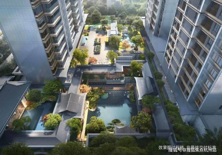 采用“王府中式”设计,大门为歇山顶形制(宽53米、高近11米),配黄铜狮、罗汉松及蓝翡翠奢石。园林融入西湖十景元素,如“花港观鱼”水景、“柳浪闻莺”绿植,并设雾森系统首层单元门厅石材铺就,肌理沉稳。