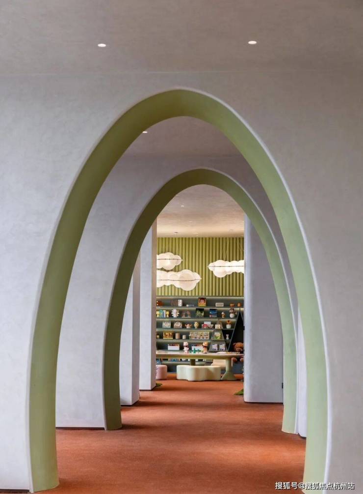 第二个,“向阳而生”。运用大面积的落地玻璃窗,让这个区域变的更加透亮。让绿意充分渗入,实现近距离、无遮挡观景视野。试想一下那个画面,当家长在外奔波一天,回家的路上,看到暖暖的光从玻璃盒子中映射,孩子笑的天真烂漫,回家的脚步也会不自觉的变得轻快了。