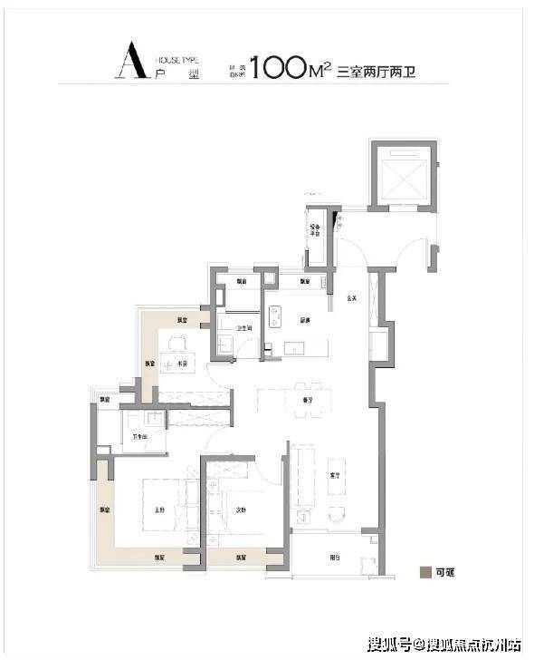 100㎡户型,双270°飘窗设计(南向主卧+北向书房),南次卧、厨房、双卫飘窗,厨房烟道外移,飘窗配置抽屉,极致空间利用率。