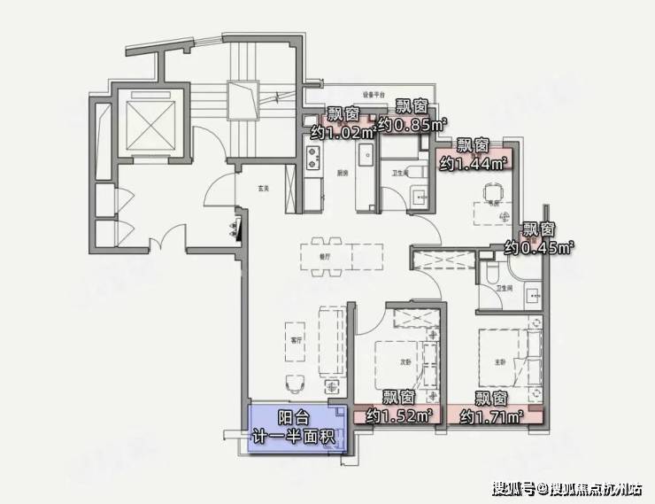 项目百平三房,在计算阳台一半面积+飘窗赠送面积的情况下,实得率可以达到91%左右,完美覆盖了当下普通高层的得房率痛点。