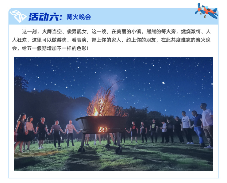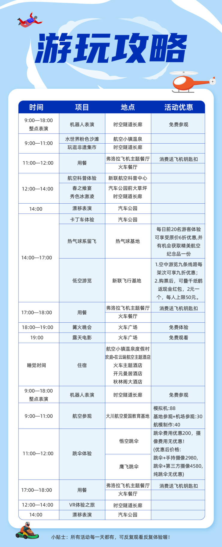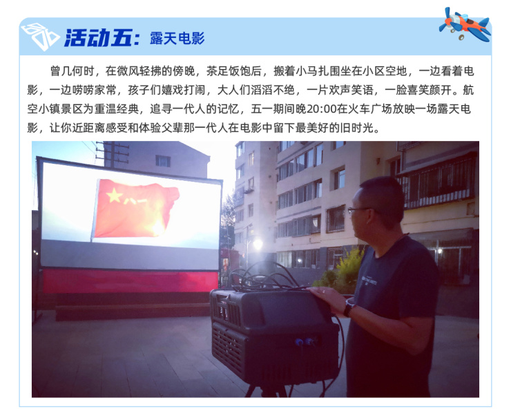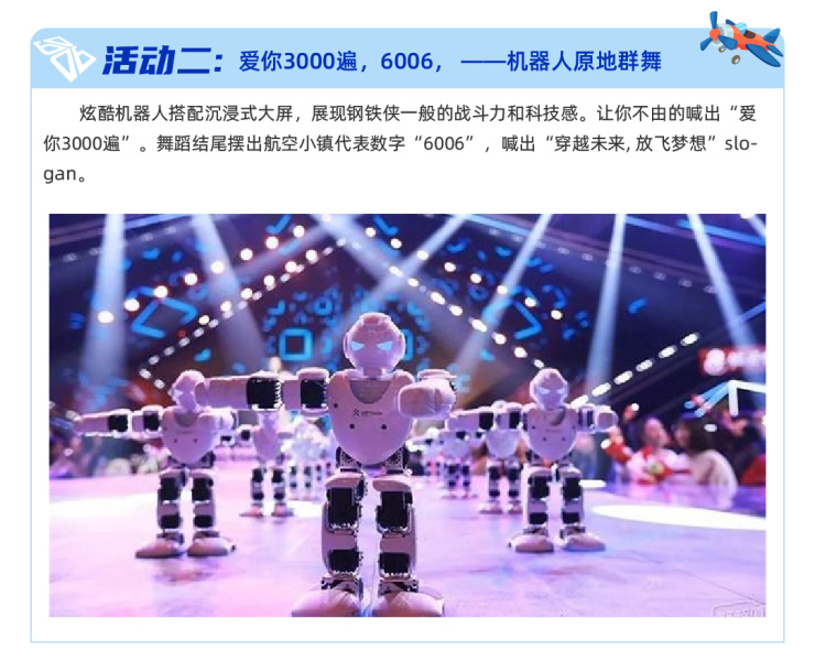 航空小镇火车广场(时代芳华 露天电影 篝火晚会)——时空隧道(非遗集市——VR空中体验之旅——人工智能-机器人)——航空参观(机场服探秘航空)