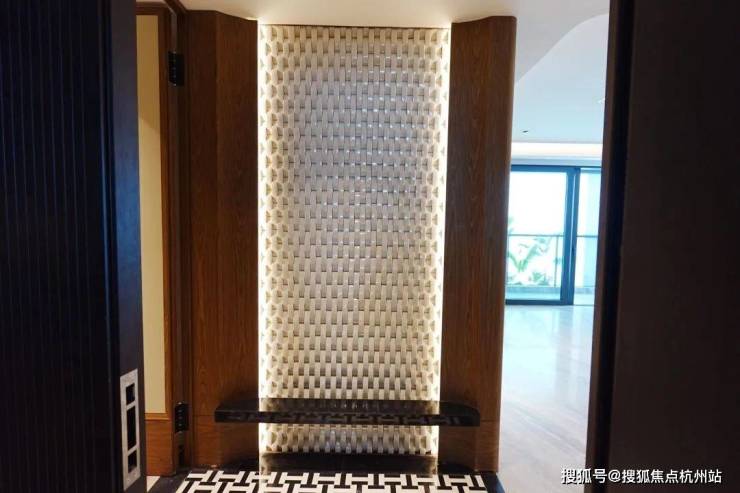 另一个样板间则是170㎡的,这个户型是电梯双开门的类一梯一户。开门以后映入眼帘的是陶瓷的编织纹玄关背景墙。