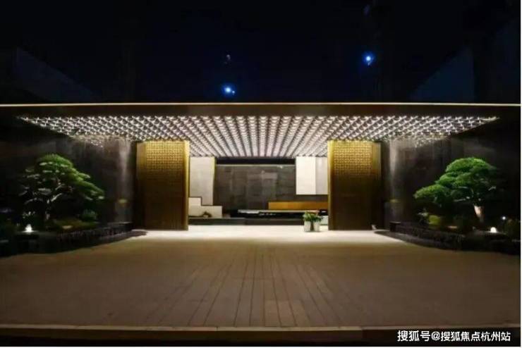 95米长的西大门长廊率先映入眼帘,乱纹黄古铜饰面与深色奢石大理石碰撞,顶部金属铝板立体切割,彰显归家仪式感!大门内侧,照壁以中国黑石材与青白石组合,延续空间礼序!