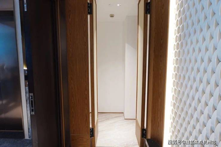 安高这次打造的交付样板间,是从电梯厅开始的。107㎡是一梯两户,电梯间区域,主要以不锈钢条作为通高区域的墙面划分,吊顶带金属弧线。入户门前,金属面板搭配编织纹,从上方打下来的暖色调灯光,映照在项目logo和室号之上,让业主从电梯里出来走到家门的时候就已经给满了仪式感。