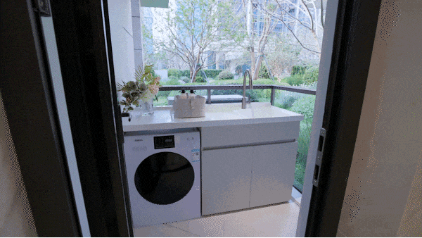 第一刀, 是阳台与卫生间、厨房的功能重组,堪称小户型动线优化的神来之笔 。把北设备阳台跟厨房、卫生间打通,洗衣、家政动线从此隐形,彻底退出起居空间。这套操作,在同面积段里很难再找到第二家。