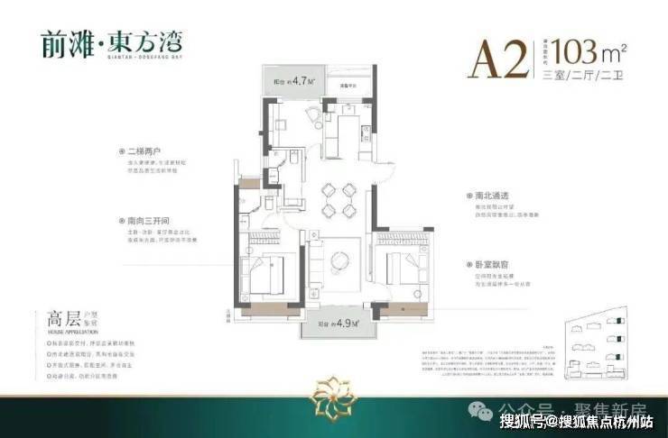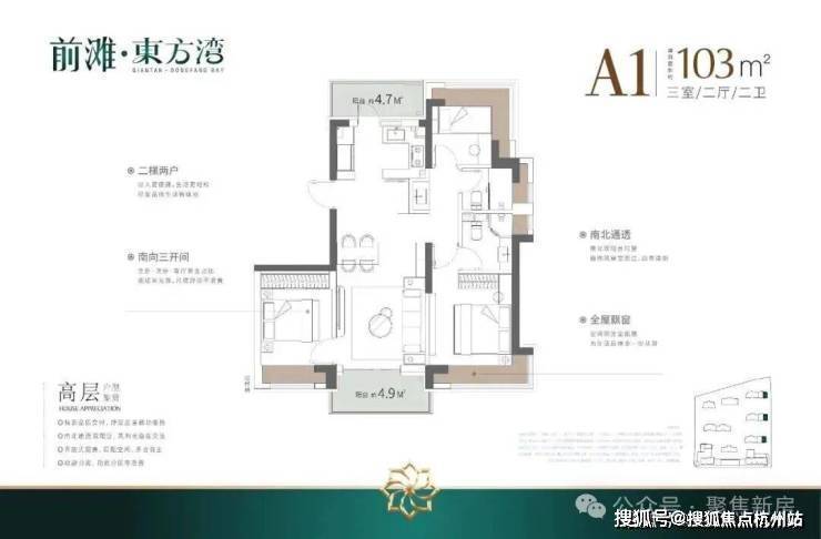 建面103㎡3房2厅2卫,户型三开间朝南、室内“5个飘窗+2阳台”,不管是采光、视野、通风、私密性,还是实用性都十分出色.
