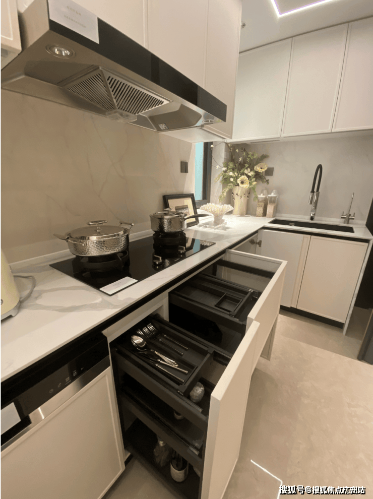 进门可以看到经典的S墙设计,L型厨房操作台面,也是暗藏不少细节——玻璃移门采用