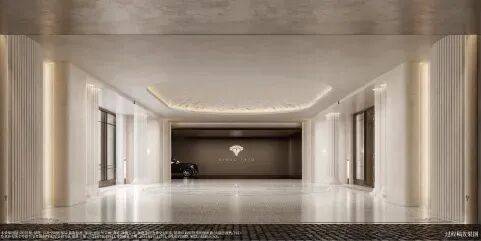 预接待厅地面瓷砖采用威尼斯白与爵士白石材拼花设 计,纯人工铺装保证花纹的奢华质感。
