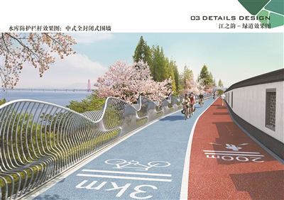 其中,水库沿江部分将采用波浪线的金属栏杆,给人一种极具活力和动感的视觉冲击。慢行道、跑道、自行车道全线贯通后,将是一条充满杭州特色和文化的“形象绿道”。据之江城投负责人介绍,“在道路两旁,将栽培樱花、马鞭草、波斯菊等花草植物,还有枫树、银杏树也会陆续进行移栽,以后市民来到绿道,就能欣赏到四季的美景。”