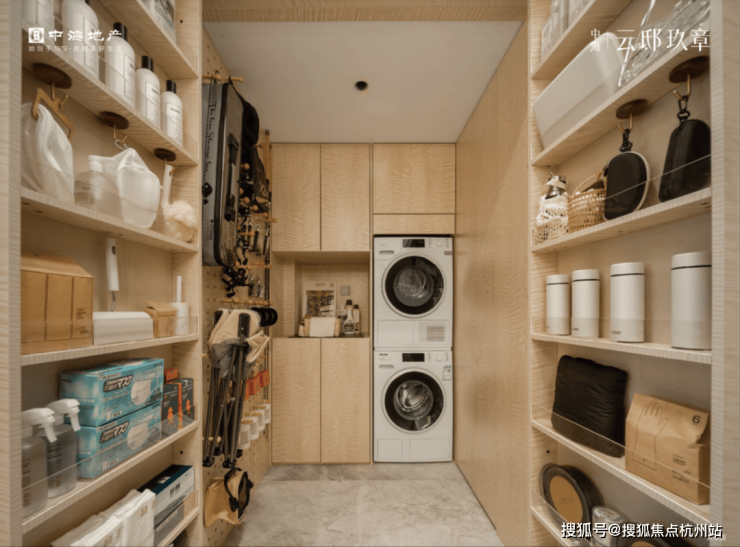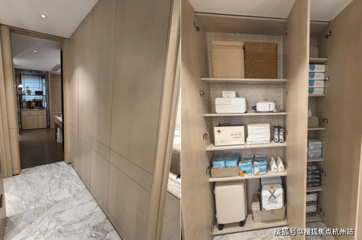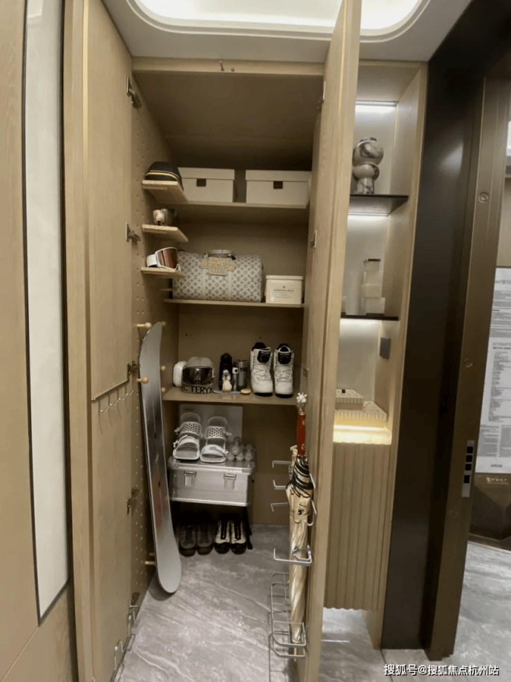 第三是‘奢’:细节奢配。 进门即享一个全交付的独立家政储藏间,洞洞板、储物柜全部做好,行李箱、杂物、清洁工具统统收纳其中,关上门家立刻整洁如初。这种配置通常只在200平以上的豪宅里才会出现。