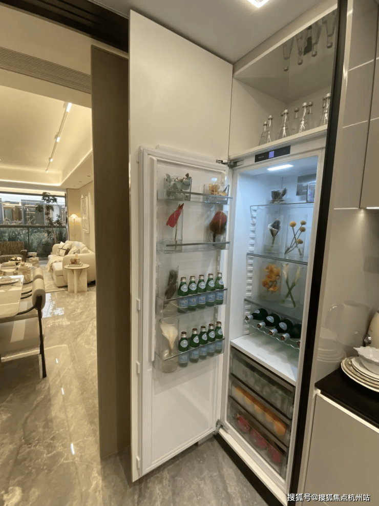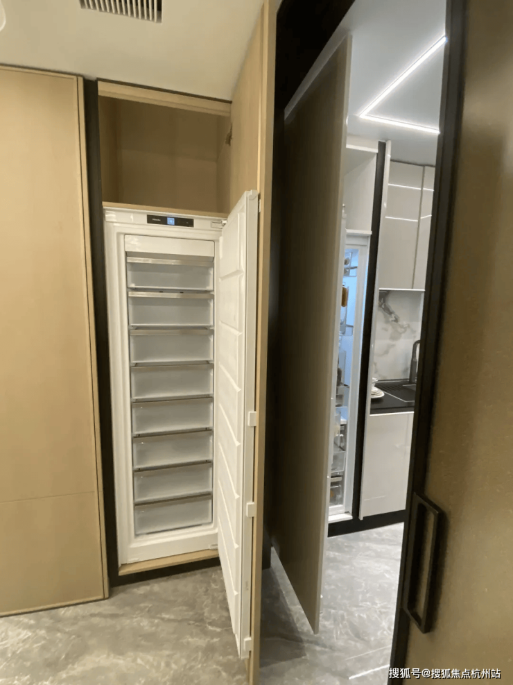 厨房单独的冷藏冰箱和柜体结合,生鲜储藏量翻倍,方便烹饪时切配。冷冻区则设置在餐厅,方便就餐时取用冰激凌等即食冻品。