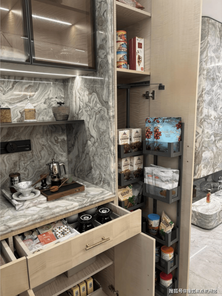 餐厅靠墙布置了通高餐边柜,极致收纳,分层合理。人体工学设计,台面高度合理,在使用过程中不需要弯腰;移动电力轨道可满足台面自由布置各种厨电,高度预留充足,能放下专业级咖啡机。顶柜可作为酒柜、玻璃杯架,底柜设计托盘式抽屉,满足多样餐具收纳。