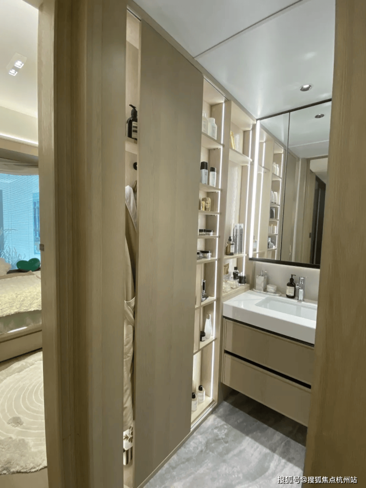 次卫的北墙面向宽敞的北卧室借了300mm的宽度,满足了卫生间对消耗品的储藏需求。样板间做了移门设计,近洗漱台设置了七层隔板置物架,满足全套护肤品的收纳。