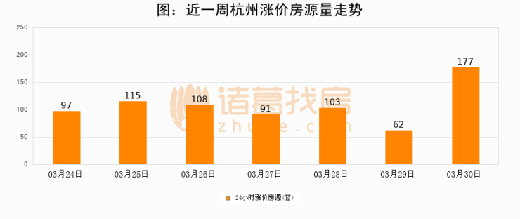 根据诸葛找房数据显示,杭州24小时涨价房源量为177套,较03月29日增加115套,环比上涨185.5%。与此同时,涨价房源占比小幅扩大,业主信心有所提升。