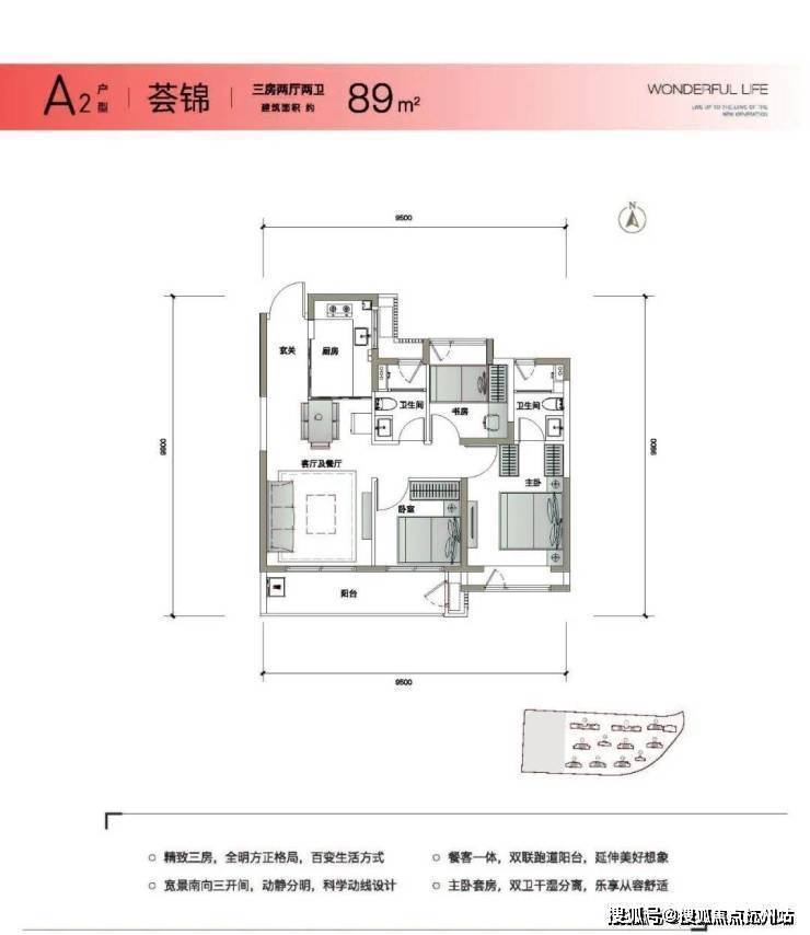 约89-120㎡全能精致户型,毛坯&精装的双重选择,3/4房2厅2卫的户型设计,匹配成长型家庭,聚合沪上品质菁英青年。
