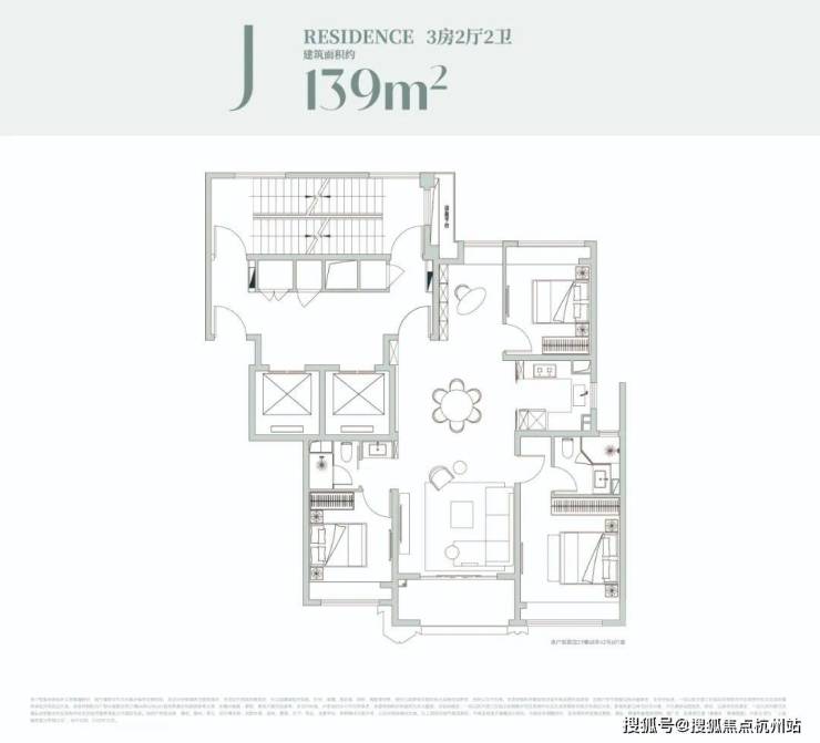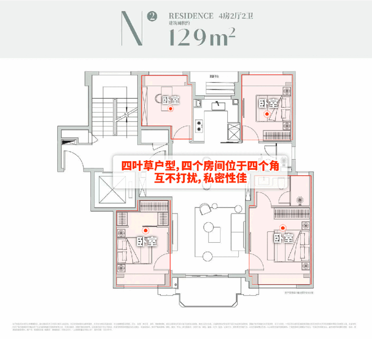 建面约129㎡4房:四叶草布局,核心滨江完美4房1、四叶草布局:私密感满满