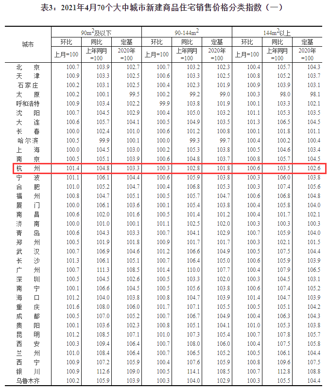 杭州新建商品住宅销售价格,环比增长0.5%,同比增长3.3%。其中分类价格指数中,90㎡及以下新建商品价格住宅销售价格涨幅较大,分别达到环比上涨1.4%,同比上涨4.8%。