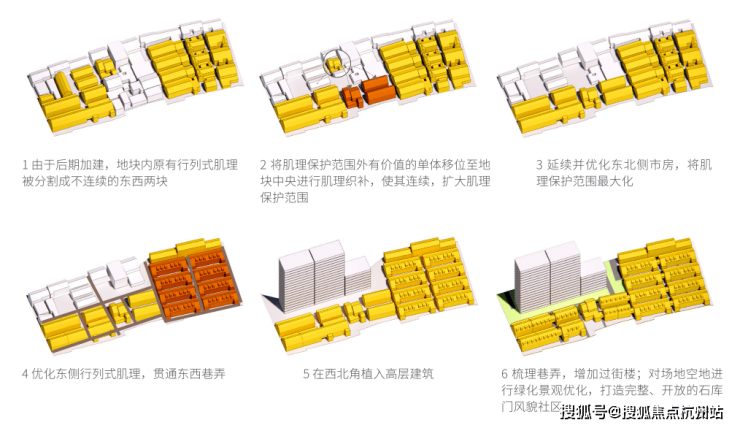 作为焕新的第一步,建筑师将得发里、鹤寿里以及永和邨南北向的建筑全部平移到地块中央进行肌理织补,拉通了原有未贯通的东西向巷弄,使行列式肌理达成连续性,并且扩大了文保部门认定的肌理保护范围。