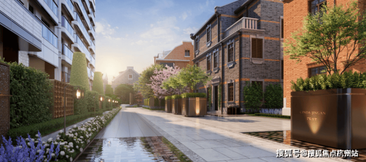 同时,建筑师还利用车行主入口的空间,结合水景、景墙和绿化打造出别具风格的开放式景观节点,并在风貌保护区的巷弄内设置端头对景,宅间花园等。
