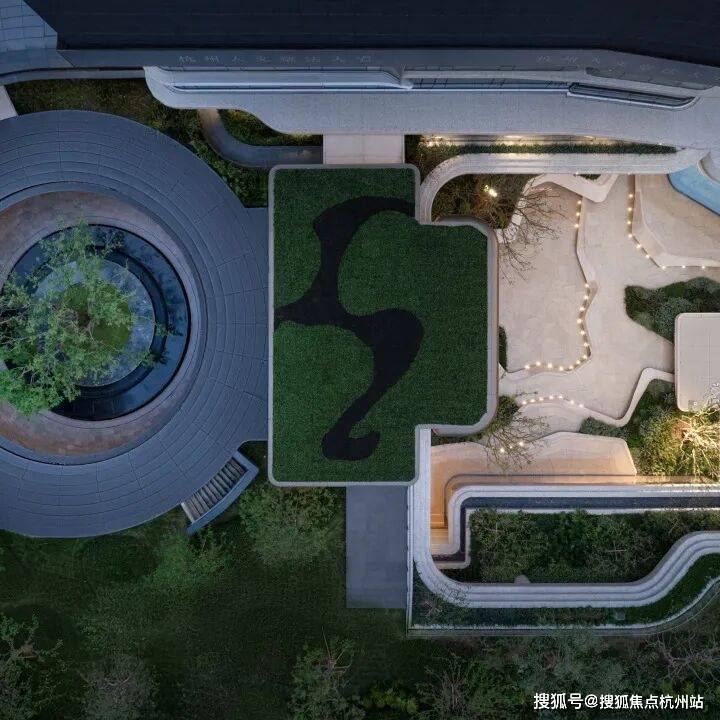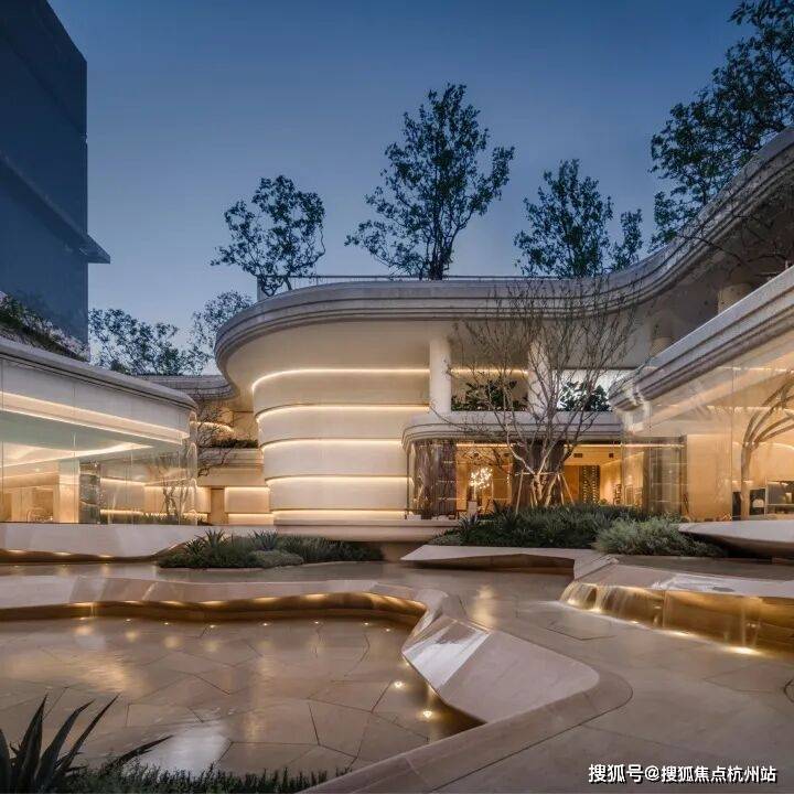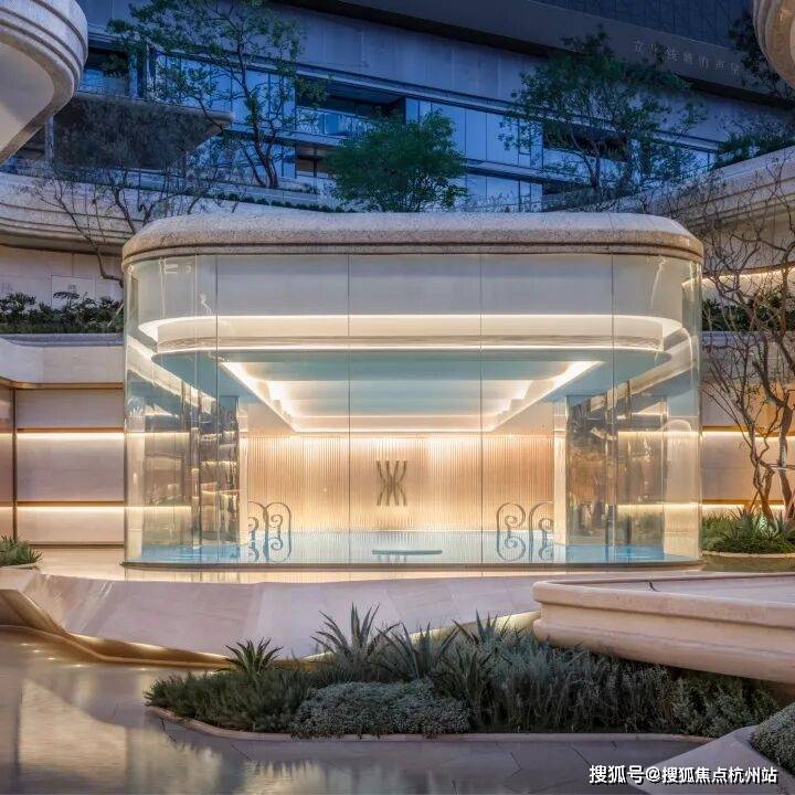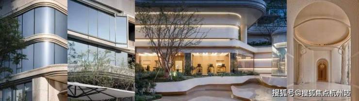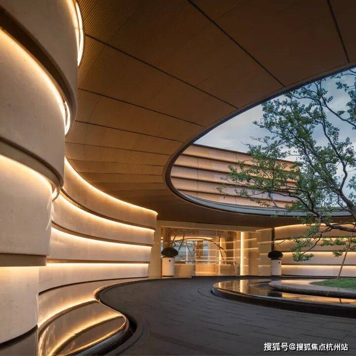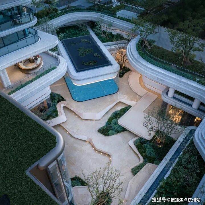 因项目整体抬高,从下沉庭院到架空层“空中花园”的落差极大,形成独特的峡谷地貌,杭序府的设计团队汲取九溪烟树为造园灵感,打造一个立体多维的城市溪谷交互园林;因项目毗邻江岸,杭序府的外立面以“站立的江潮”为灵感,