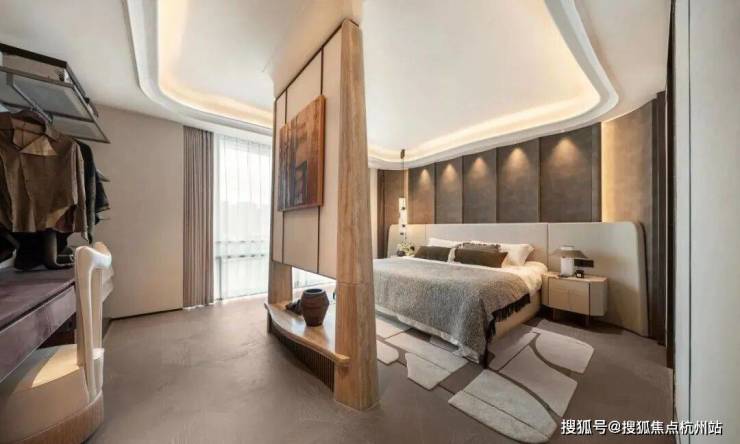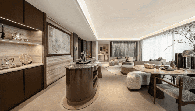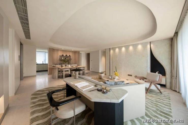 陶砚176㎡户型:取陶砚之自然璞实感,雕琢白冰玉的背景墙,客厅吊顶还原砚台造型,室内饰以瘦金体笔划装饰线条。从太太幸福厨房系统、天使之眼安全监控平台,到宠物清洁站,杭序府用洞察赋智慧以温度,让科技完成从工具到人性的进化。