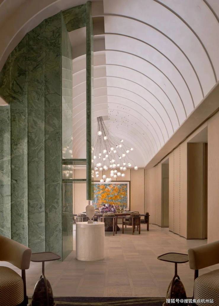 地上二层是约5米高的架空层,作为杭州首个与西泠印社杭州书画社深度合作住宅项目,杭序府楼幢架空层内打造西泠文房艺术空间,拥有金石文化定制主题会所服务系统,提供独具杭州文脉特色的定制化社区服务。