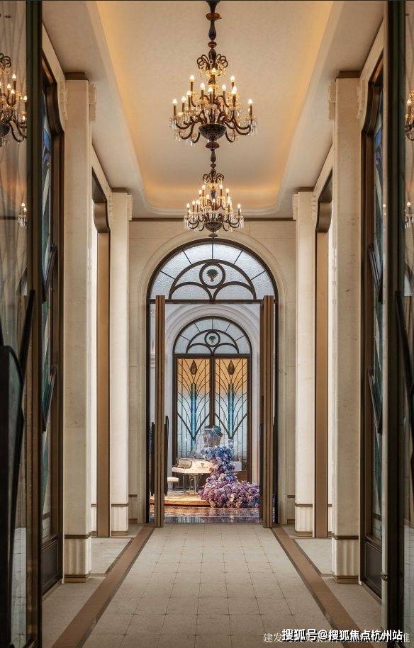萃取东方色谱精粹,建发·海宸甄选丝箔流金、东方雅铜,青釉奢蓝,以当代笔触晕染立面,令传统色彩在空间生长为永恒的诗意,「入户门头」形取和平饭店经典拱门,配以碧绿色天然石材门套、彩玻花窗,重现百年外滩门廊的尊崇仪式。