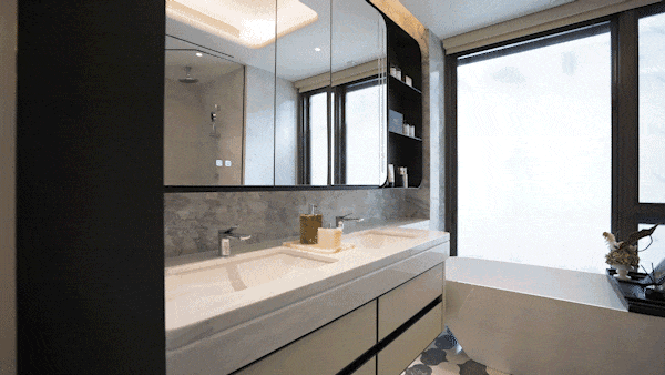 另外,卫生间也是配置拉满, 劳芬 的马桶、 当代 的龙头、内置 美妆冰箱 的镜柜、 大理石 的地面、 江南烟雨 奢石的墙面一应俱全!
