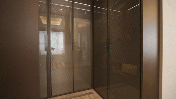 背景墙的 艺术壁布 、衣帽间的 夹丝玻璃门 、地面的 回型拼花 ,处处是低调又高调的质感
